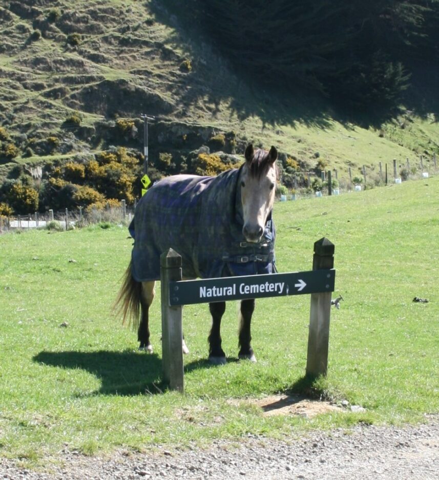 Cars usually park within the Makara cemetery grounds, by the farm gate which leads to the gravel driveway marked by the Natural Burial signpost.